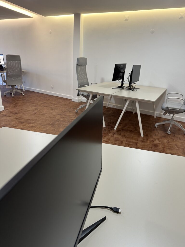 Our 100m² open-space layout is designed for clarity and comfort – with large desks, ergonomic chairs, and 27-inch screens ready for use.